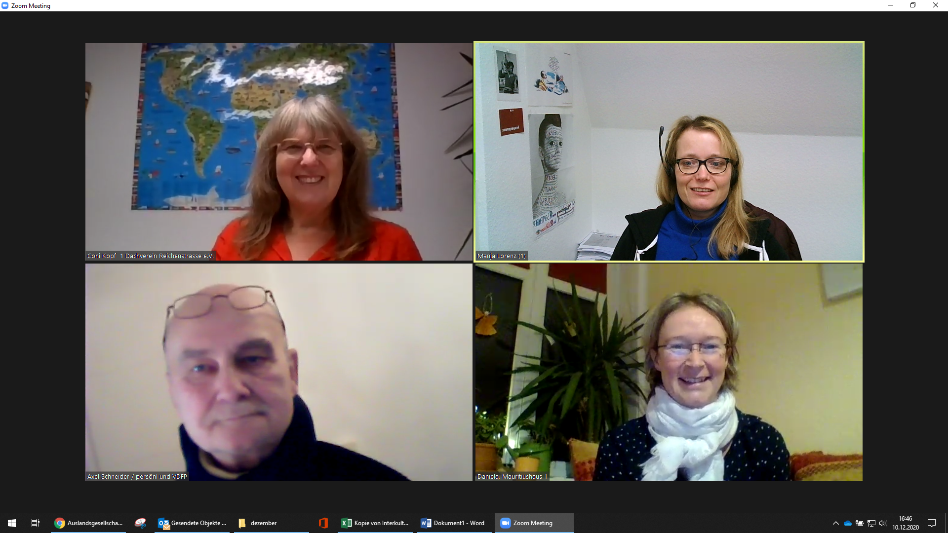 Am 10.12. fand unsere digitale Mitgliederversammlung statt. Hauptinhalt: die Wahl des Vorstands. Wir freuen uns sehr, dass unser bisheriger Vorstand sich wieder zur Wahl gestellt hat und auch fast einstimmig wieder gewählt wurde.