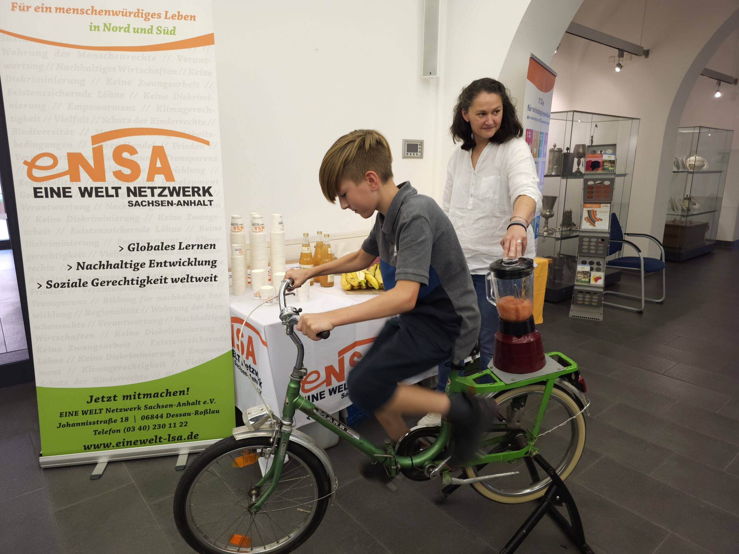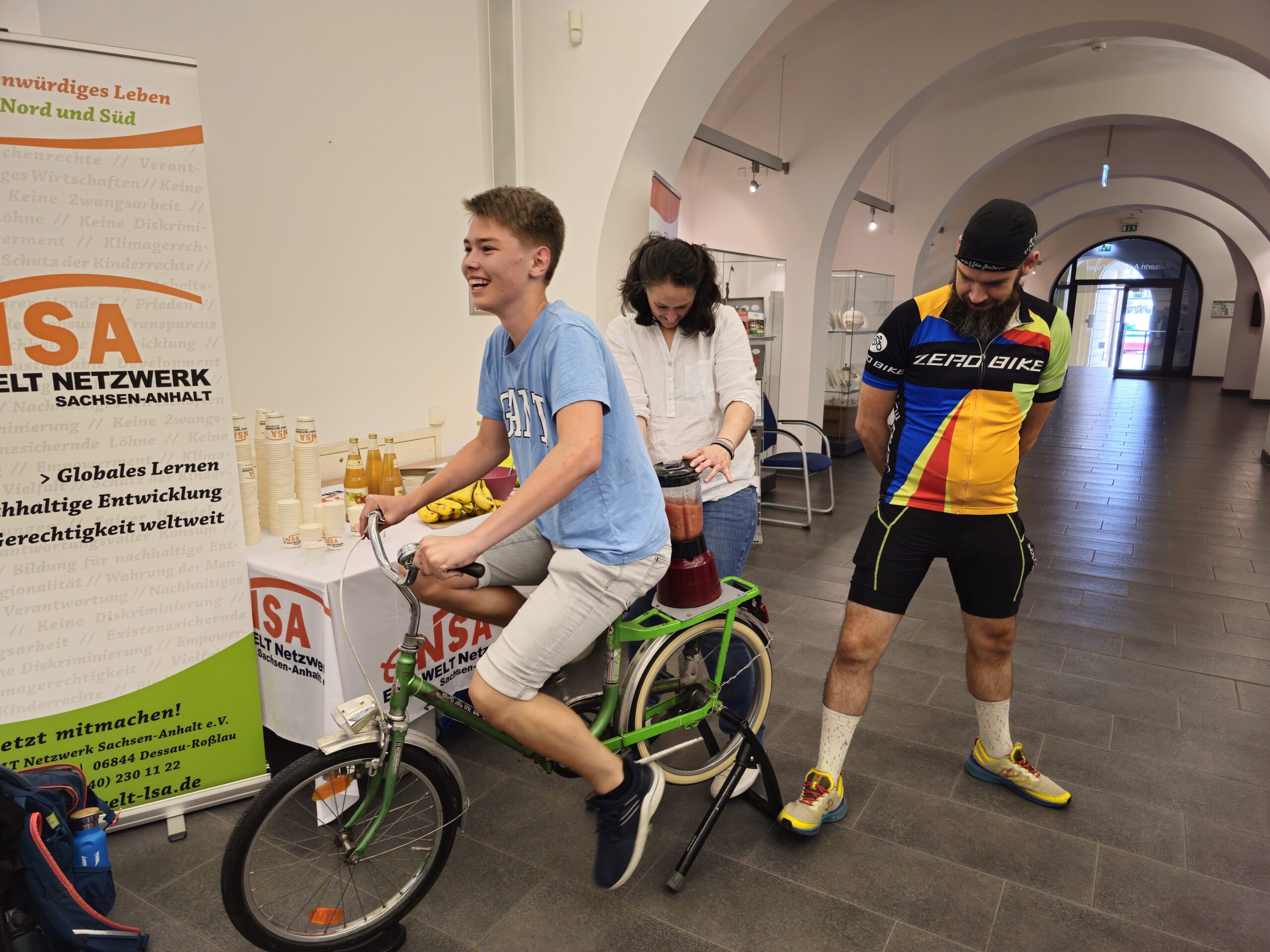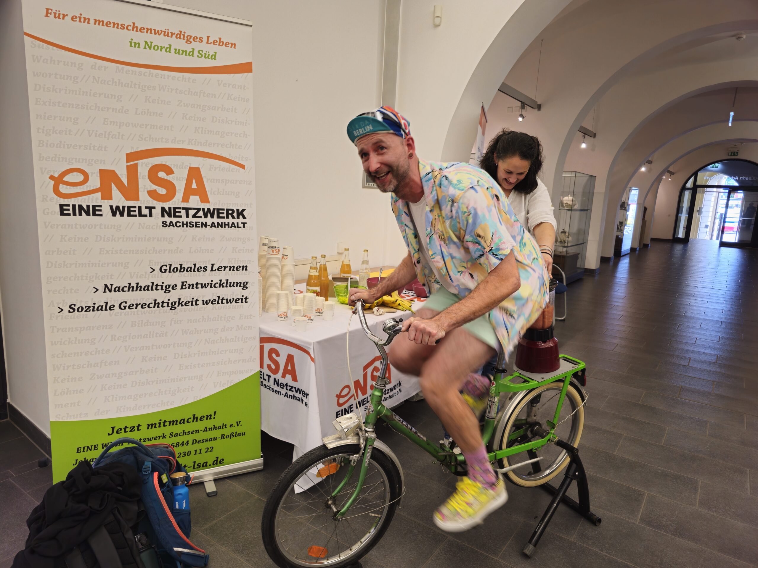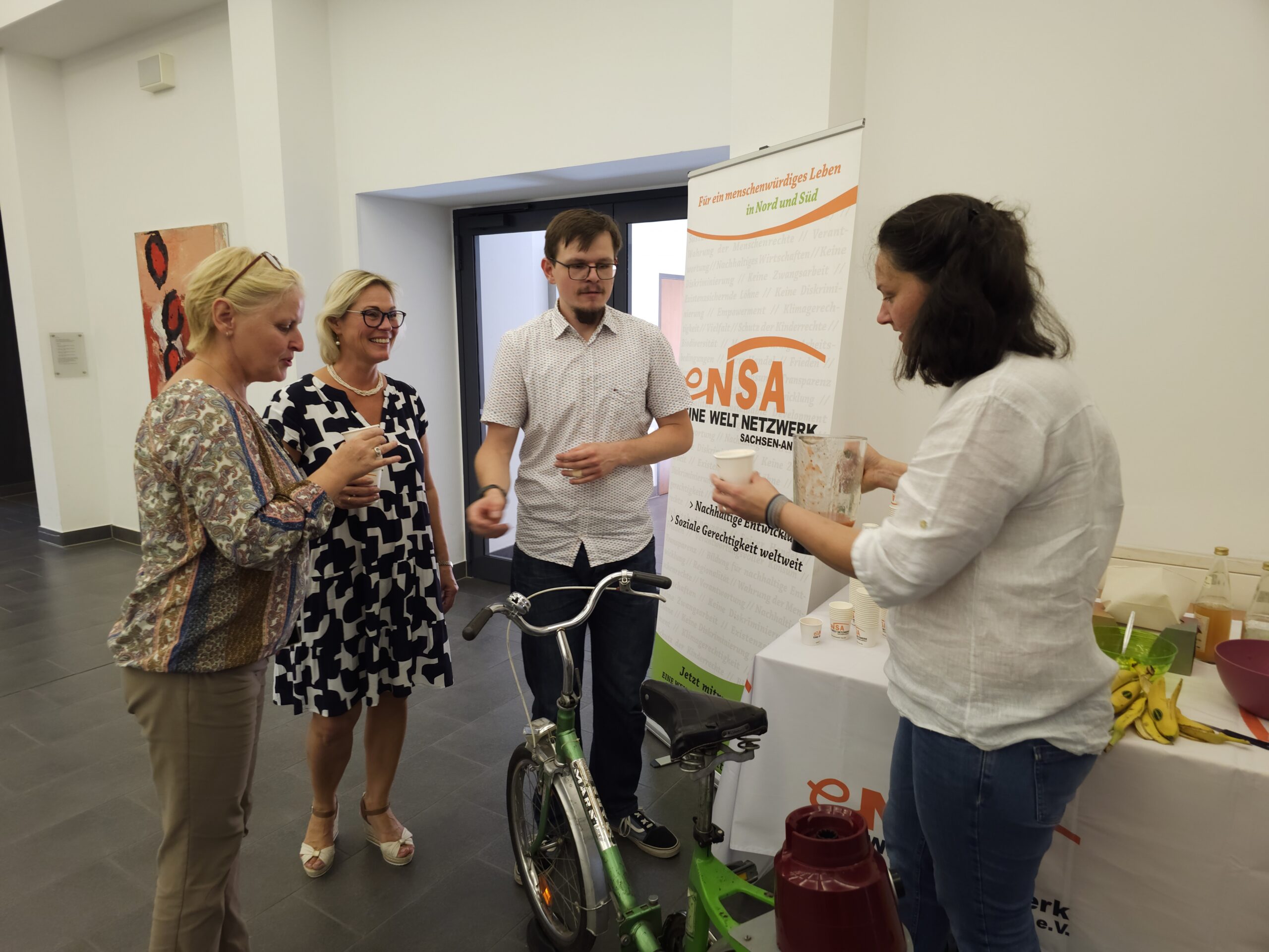 Das EINE WELT Netzwerk Sachsen-Anhalt war mit Smoothie-Bike und reichlich Informationen bei der Preisverleihung der Aktion Stadtradeln 2023 im Magdeburger Rathaus dabei. Nach dem Einsatz auf dem ENSA-Smoothie-Bike freuten sich unter anderem die Teilnehmenden Schüler:innen des Werner-von-Siemens-Gymnasiums und das Team von Juppidu Holiday Sports über einen leckeren Früchtemix und konnten sich bei Projektkoordinatorin Lisa Zander zu bio, regional, fairen Produkten sowie zur entwicklungspolitischen Bildungsarbeit informieren.