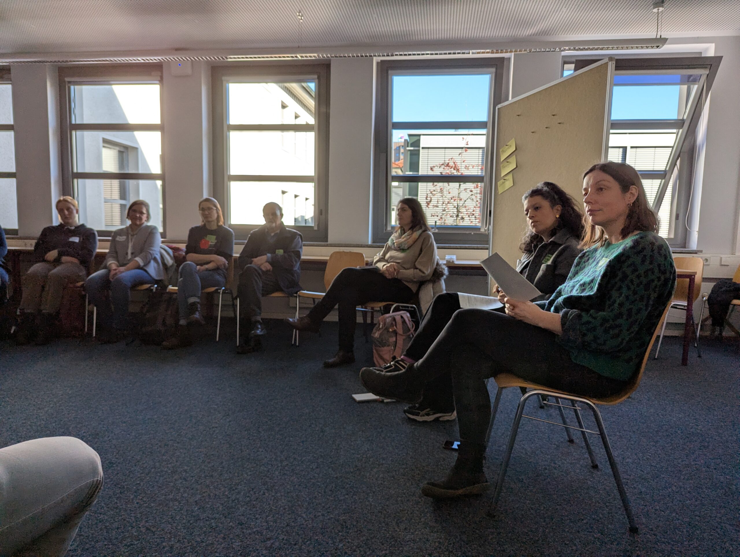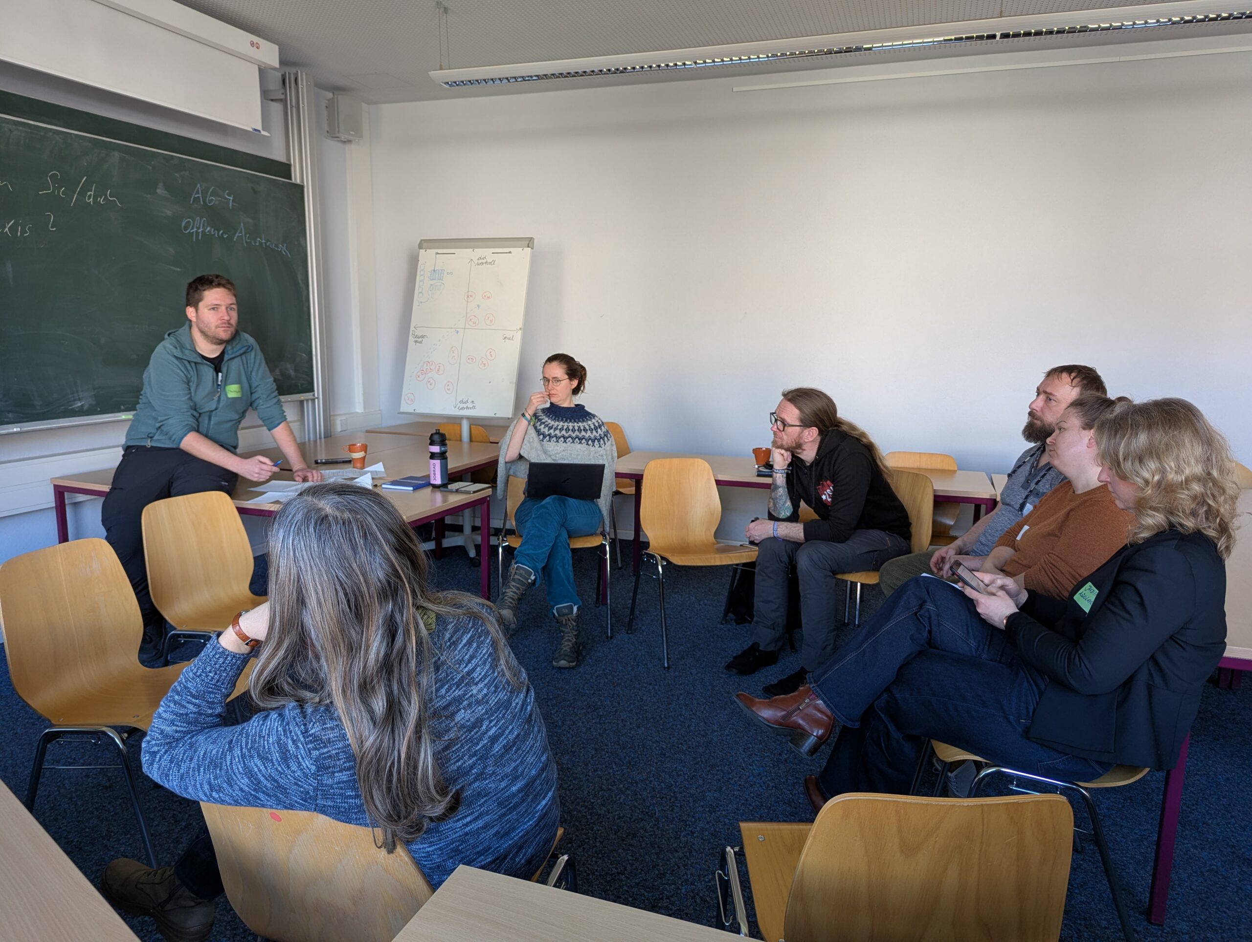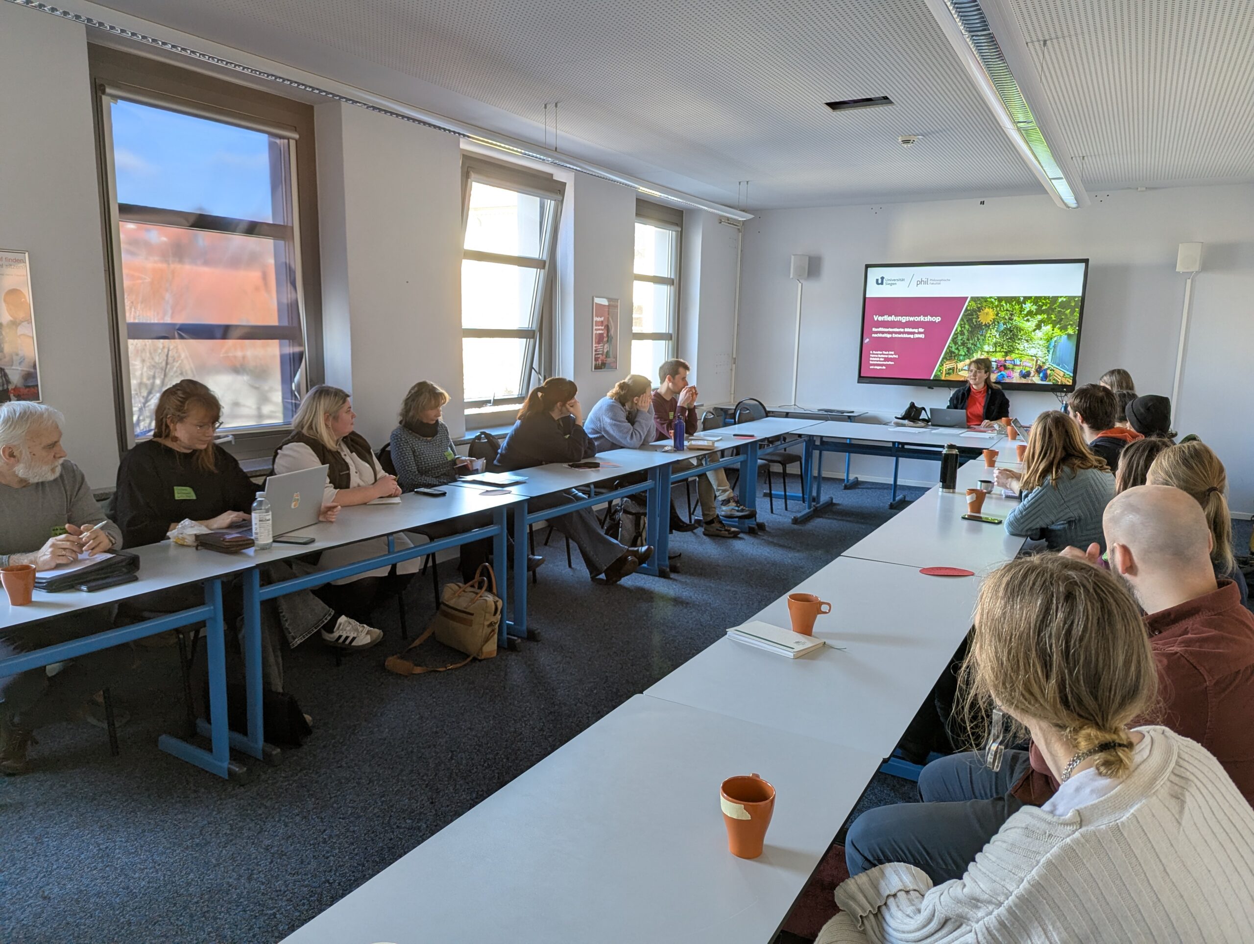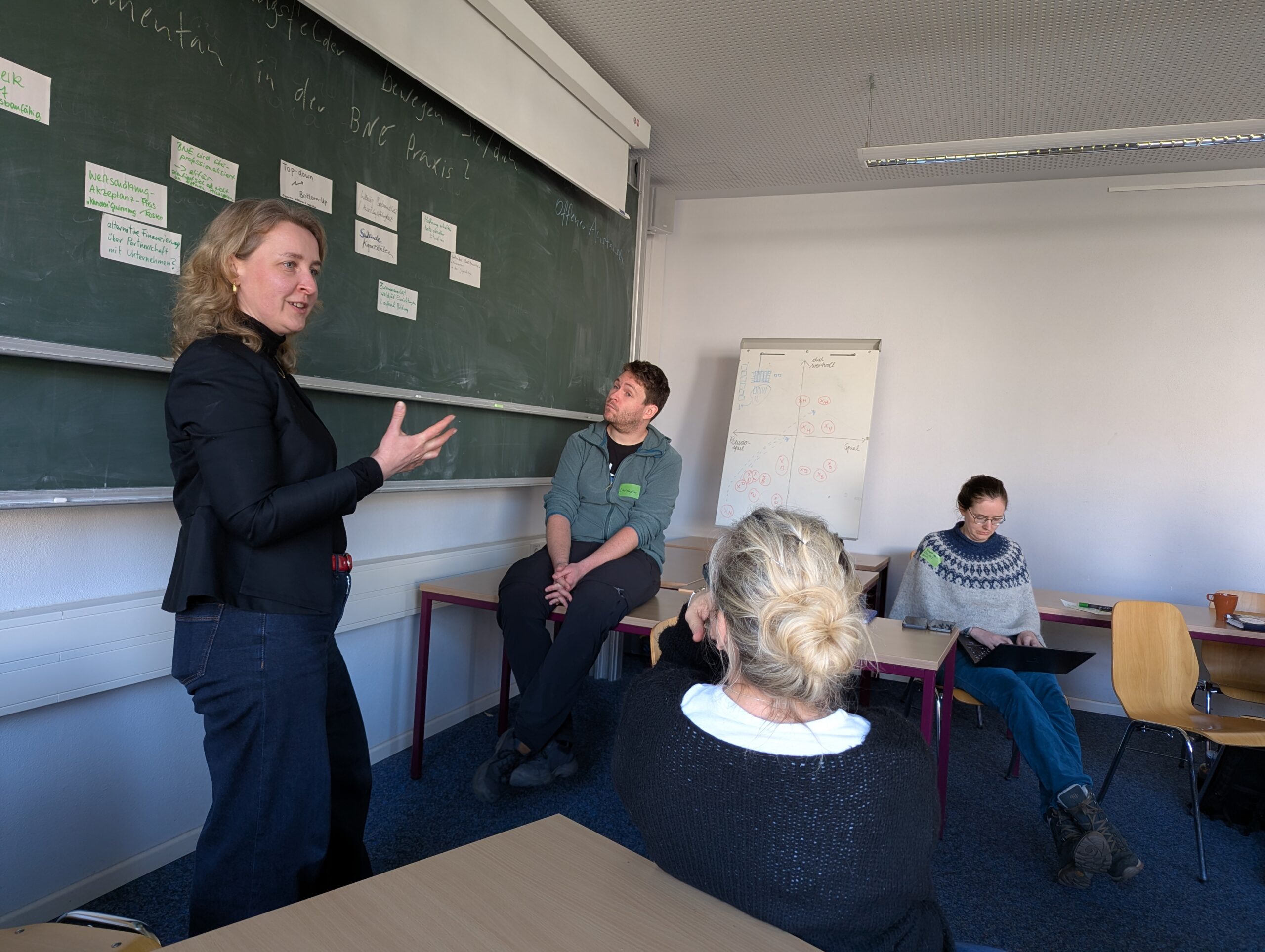 Am Nachmittag fanden Arbeitsgruppen statt. So konnten sich die Teilnehmenden im Workshop mit Hannah Butterer vertiefend mit der „Konfliktorientierten Bildung für nachhaltige Entwicklung“ beschäftigen. Anhand von Materialien, die ethnografisch in Form von teilnehmenden Beobachtungen erhoben wurden, wurde verdeutlicht, wie Lernende auf die BNE-Praxis reagieren. Dies wurde zum Anlass genommen, gemeinsam über die eigene Bildungspraxis zu reflektieren und darüber nachzudenken, wie BNE und politische Bildung bzw. Demokratiebildung stärker zusammen gedacht werden können.