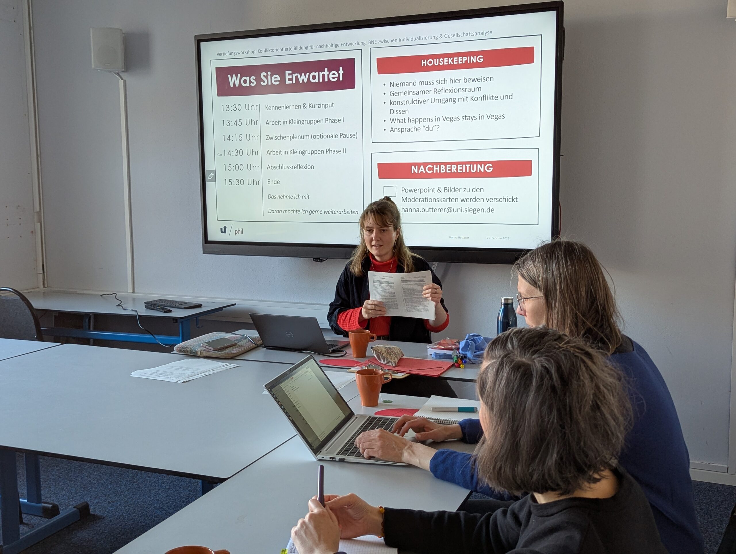 Den inhaltlichen Auftakt gestaltete Hannah Butterer von der Universität Siegen mit einem Beitrag zum Thema „Konfliktorientierte Bildung für nachhaltige Entwicklung: BNE zwischen Individualisierung und Gesellschaftsanalyse“. Sie gab zunächst einen Einblick in zentrale Begrifflichkeiten der BNE sowie in die historische Entwicklung des Diskurses um nachhaltige Entwicklung.