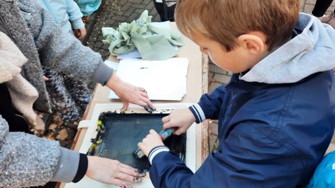 An der Siebdruckstation konnten die Schülerinnen und Schüler ihre alten T-Shirts oder Stoffbeutel mit eigenen Motiven bedrucken. Der Siebdruck auf alter Kleidung stand im Zeichen des Upcyclings, einer Praxis, bei der aus alten Materialien Neues geschaffen wird. Hier wurden die Kinder für Themen wie Abfallvermeidung und Ressourcenschonung sensibilisiert.